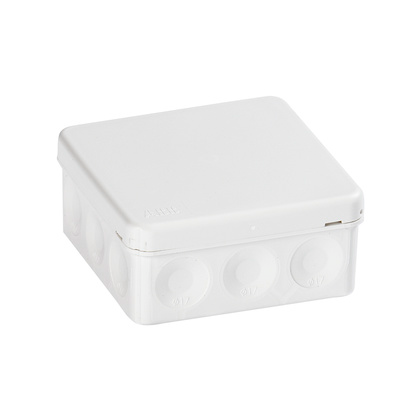 Tvåkomponents kopplingsdosa AP9 för 2,5 mm² och 500 V. Den har inbyggda strypnipplar med 12 kabelinföringar på sidorna och 2 i botten.